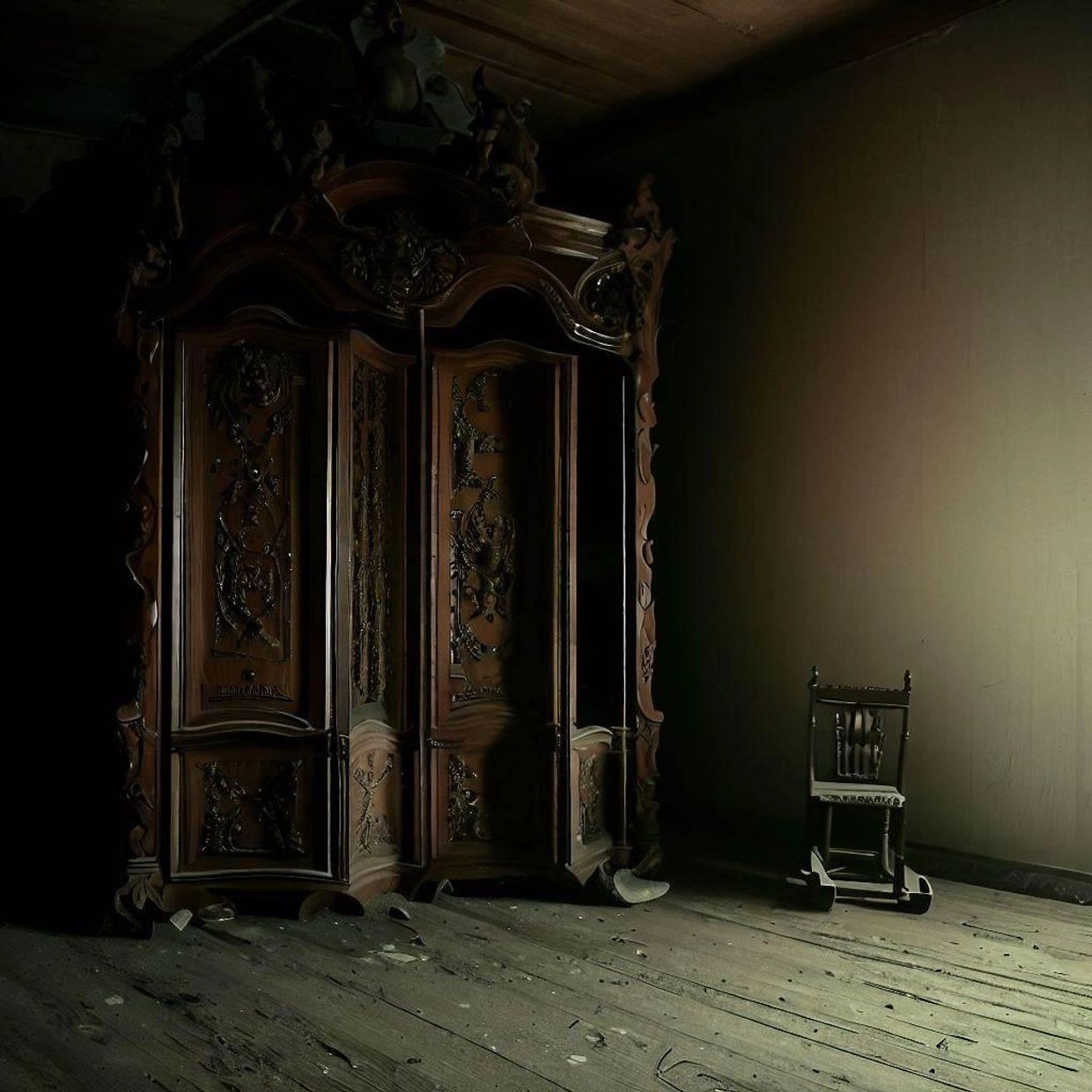 From the doorway, I could see the entire room. To my surprise, it was empty but for a large ornately carved dark wood wardrobe, with a small toy rocking chair set to its left. Because of its size, the wardrobe wouldn't fit along any one wall, and so was wedged in the far corner at a forty-five-degree angle. The only space not visible to me from where I stood was the hidden triangular area behind the wardrobe. I would have to climb up and over the top of it to find out what, if anything, was there. And strangely, I wanted to. I thought I heard a voice, still calling to me.